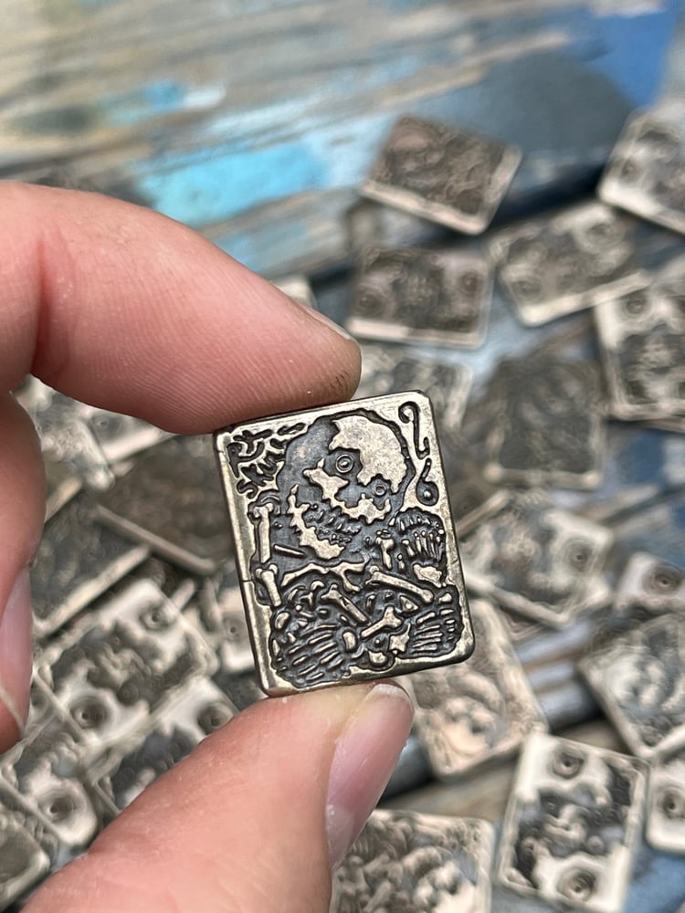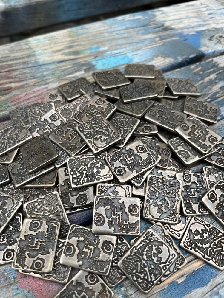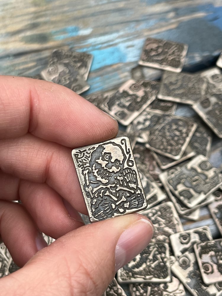Every single token is DIFFERENT. By that I mean they all have blemishes, inconsistencies, small features missing or accentuated. That's what makes them beautiful and precious. This years token features double reflected OG skulls on one side, and the crowded skeleton on the other with "RxSkulls" and "26" crammed up by his noggin.